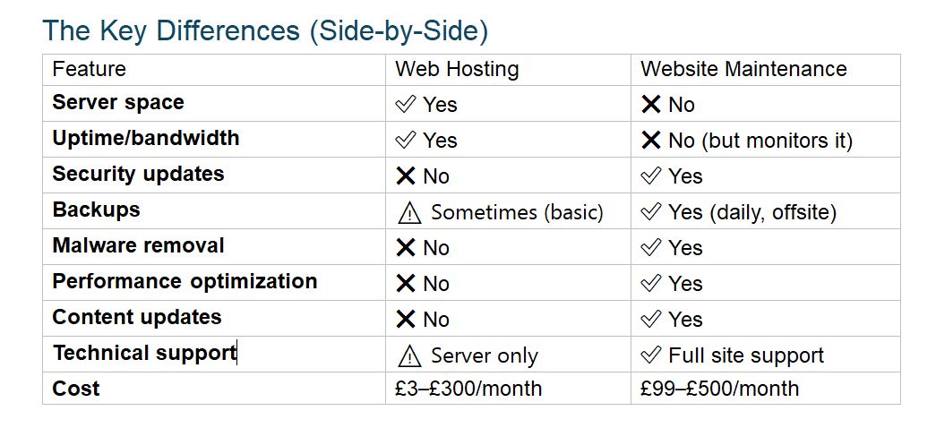 Short answer: Web hosting is where your website lives (server space and access). Website maintenance is keeping your site secure, updated, backed up, and running smoothly. You need both—hosting keeps your site online, maintenance keeps it safe and performing well.